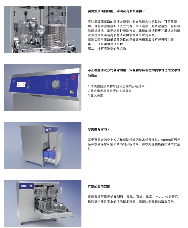 實(shí)驗(yàn)室洗瓶機(jī)通過(guò)微電腦系統(tǒng)控制高壓水的清洗水溫、清洗時(shí)間、清洗次數(shù)和高壓空氣的干燥溫度、干燥時(shí)間等并配以專(zhuān)用的清洗劑、中和劑等對(duì)各種實(shí)驗(yàn)室玻璃器皿、手術(shù)器械、牙科手術(shù)。電路板等物品內(nèi)外表面的污漬,各種化學(xué)殘留進(jìn)行360度全方位清洗、消毒、干燥處理。產(chǎn)品被廣泛應(yīng)用于藥廠,科研所食品廠、化工企業(yè)的實(shí)驗(yàn)室及生產(chǎn)部門(mén)、疾病中心實(shí)驗(yàn)室、醫(yī)院口腔科、消毒供應(yīng)中心,電子企業(yè)的生產(chǎn)部門(mén)等。